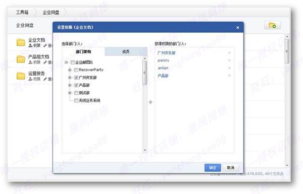 企业微盘是用于企业内部共享文件的网络硬盘,成员上传文件至企业微盘后,企业的其他员工即可看到该文件,例如上传一些公司的集体活动照片,公司的制度文档等需要共享的资源,成员登陆邮箱后可下载分享,也可以对企业成员设置权限分配。将根文件夹分配给不同的部门,或成员使用。